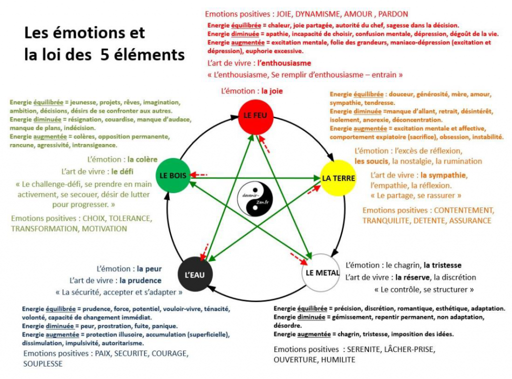 Appliquée à la physiologie, la Théorie des cinq Éléments associe un Mouvement à chaque Organe, en accord avec sa fonction principale :